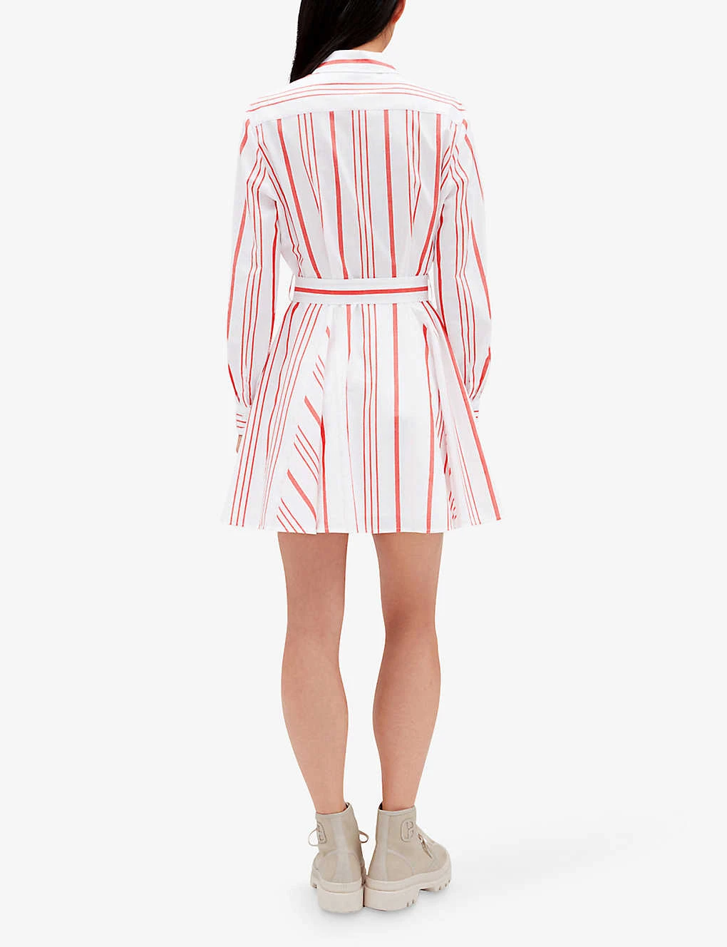 - Collared, long sleeves, stripe pattern, tie-belt at the waist, flared skirt, mini silhouette