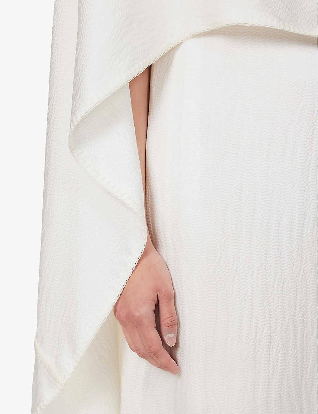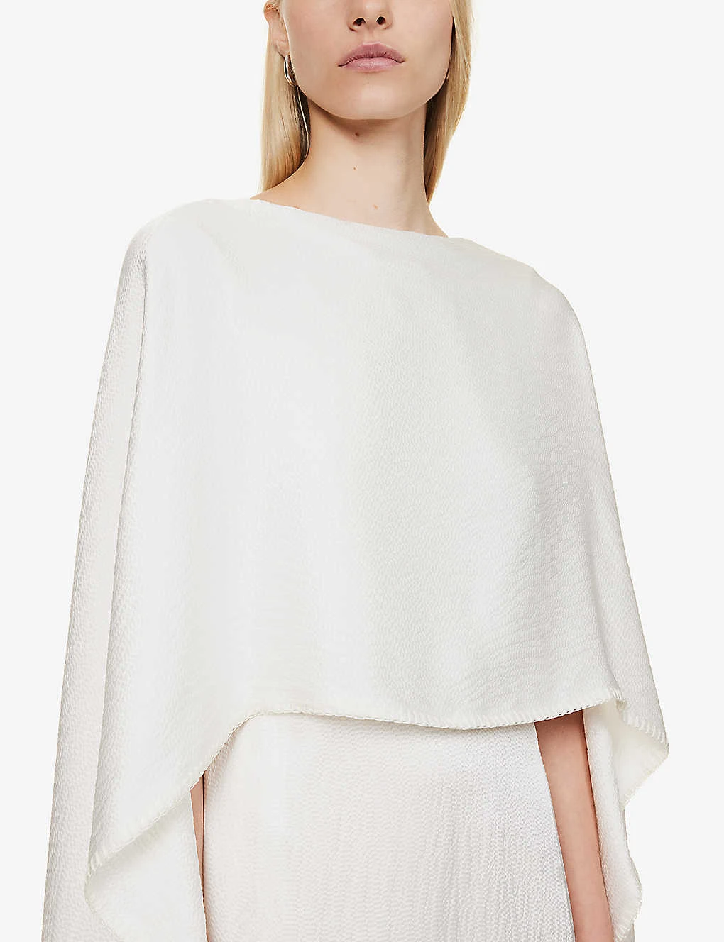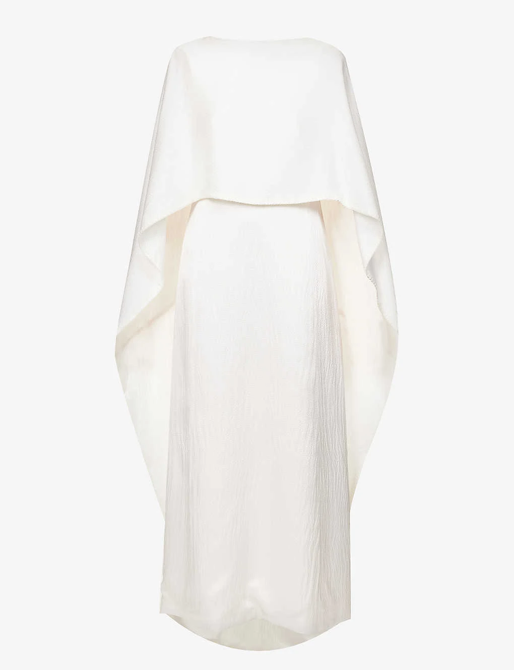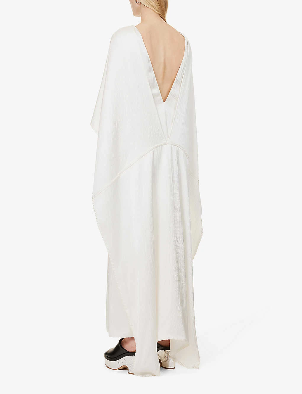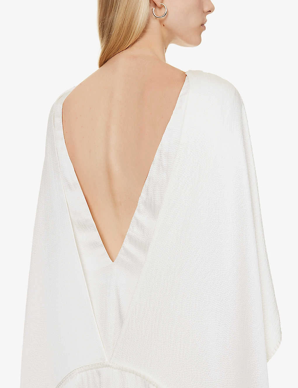 - Relaxed fit, round neckline, cap sleeves, draped silhouette, open back, split at back, lined