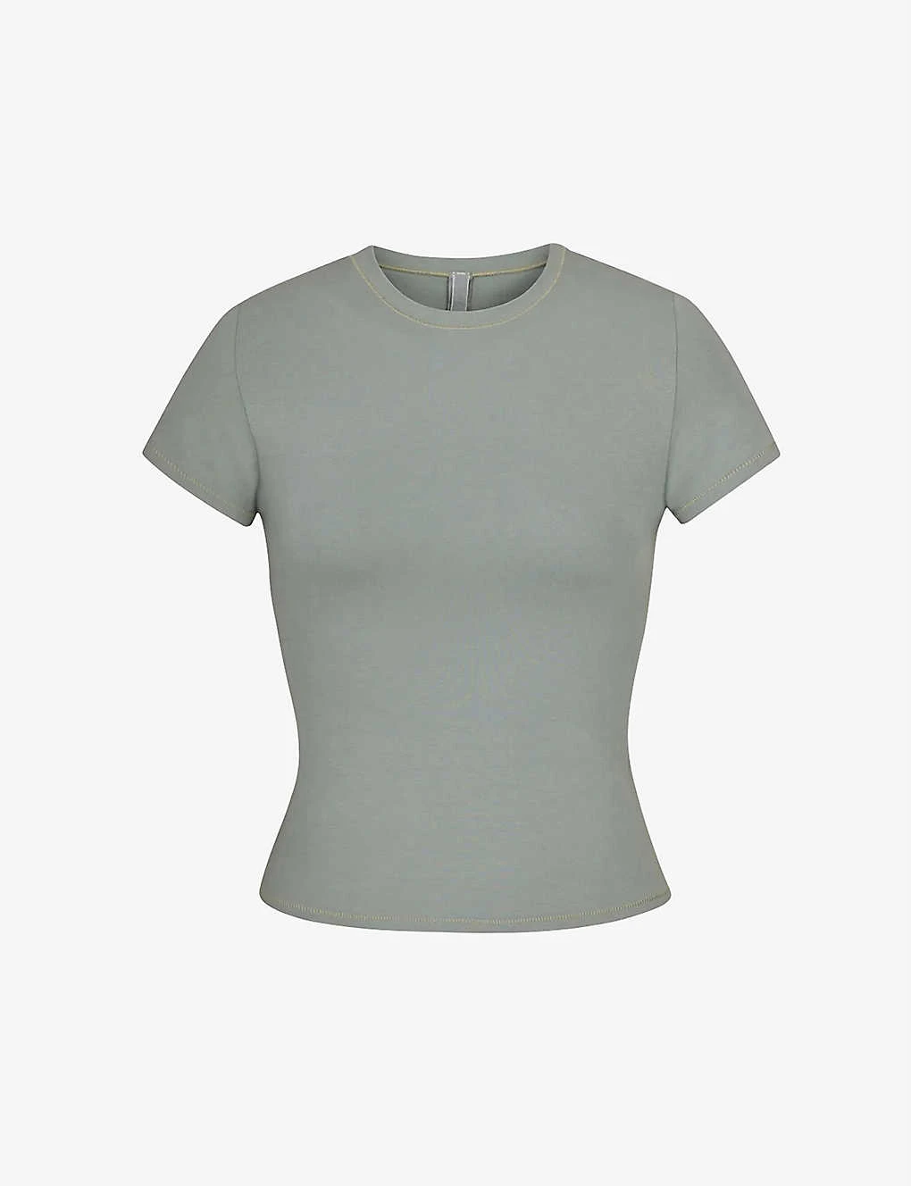 - Fitted, round neck, ribbed trim at neck, short sleeves, tonal pick-stitch embroidery