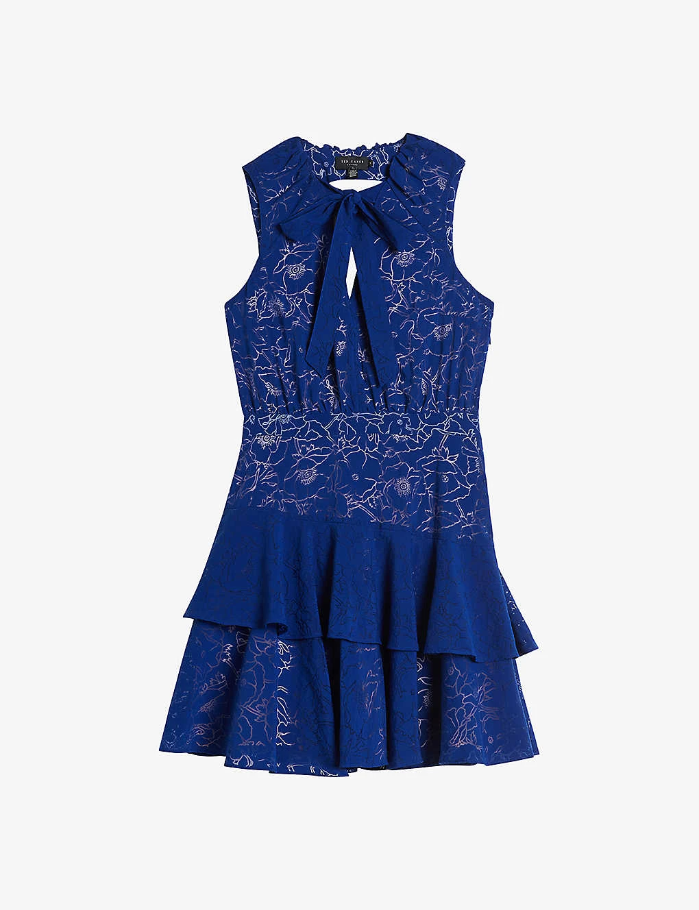 - Round gathered neck, adjustable neck ties, sleeveless, asymmetric tiered skirt, all-over devoré floral design, lined